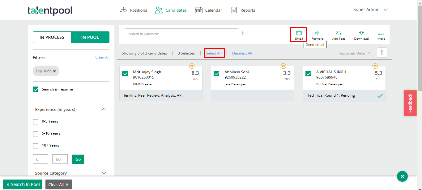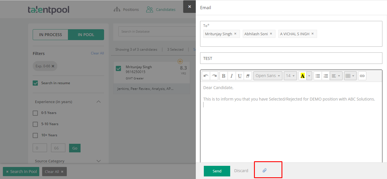 The selected candidates will be listed in recipients tab, you can draft email depending on the scenario, you can also add any files/forms as an attachment and hit the SEND button.